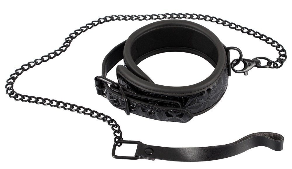 Slightly padded, black collar with an embossed surface in a beautiful diamond cut pattern. With rounded borders. Includes a matte black leash with a snap hook and wrist loop (complete length 88 cm). Collar 5.5 cm wide, the circumference can be adjusted from 40 to 48 cm. Material: polyurethane, metal, split leather, synthetic rubber.
