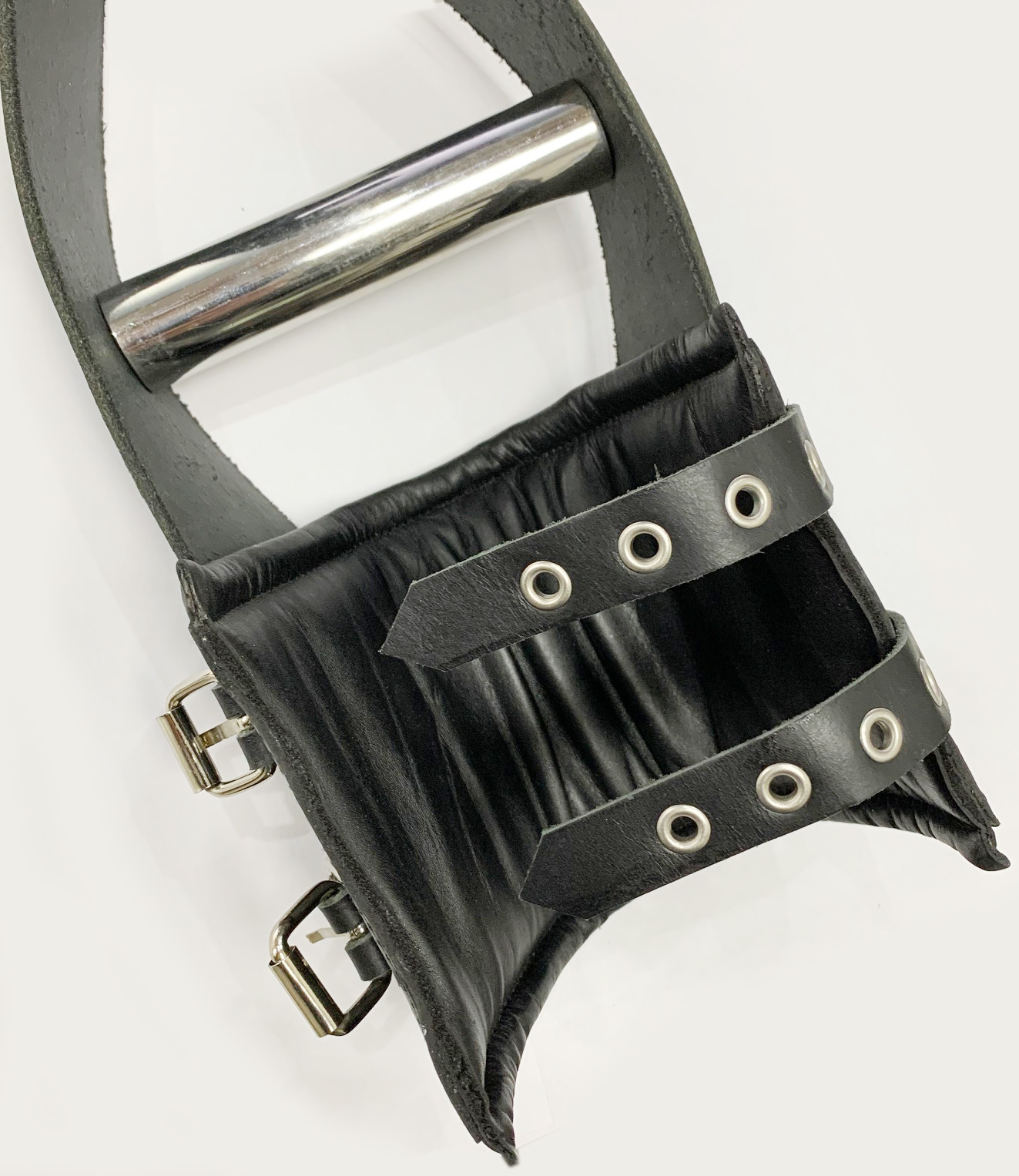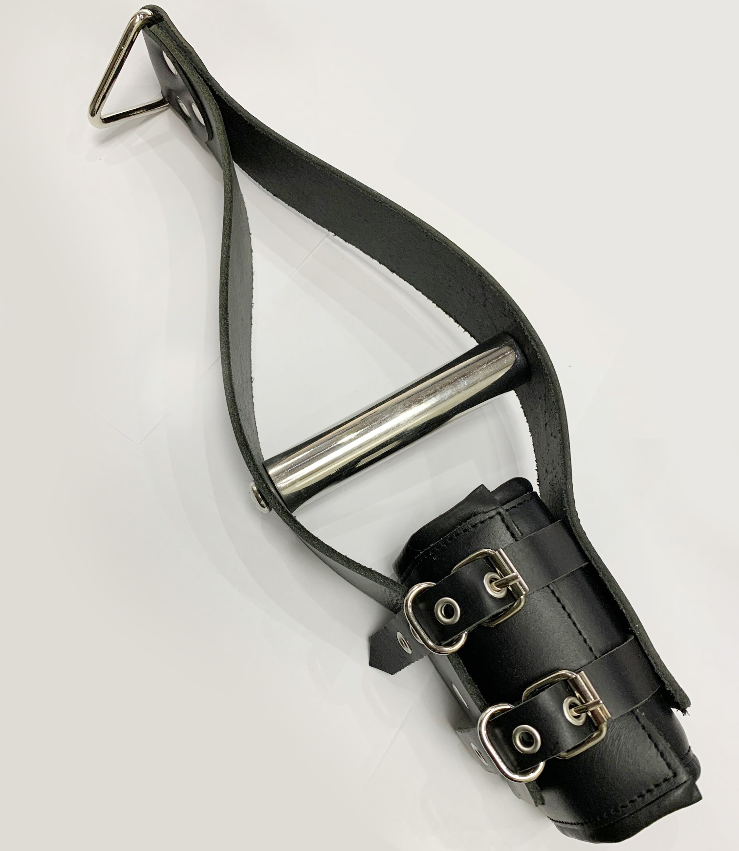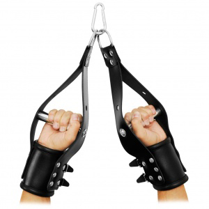 Padded, adjustable leather sleeves in black with stainless steel handles. Supports up to 100 kg. Double snap hook and chains not included. Features soft leather padding inside and wide stainless steel handle for improved comfort.