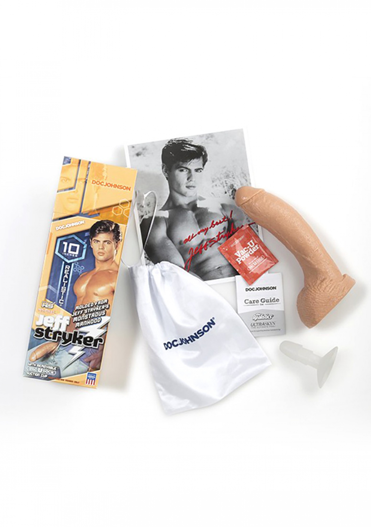 Live out your porn star fantasy! Molded directly from Jeff's hard 10" cock and plush balls, this ultra realistic cock has the perfectly curved shaft that you crave and expect from Jeff Stryker. The balls even jiggle and move when touched. It is made from non-phthalate body-safe material, which includes Doc's antibacterial Sil-A-Gel formula. Comes with included silk pouch for storage. White. Proudly made in America.
