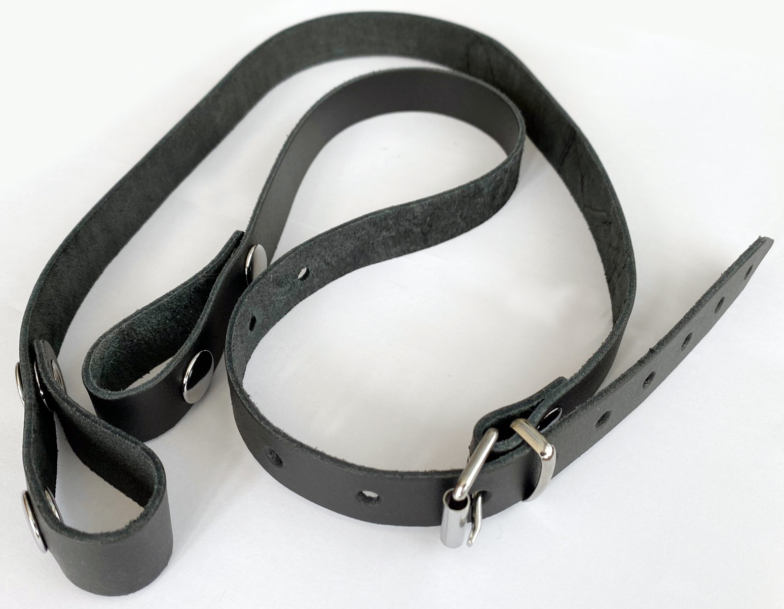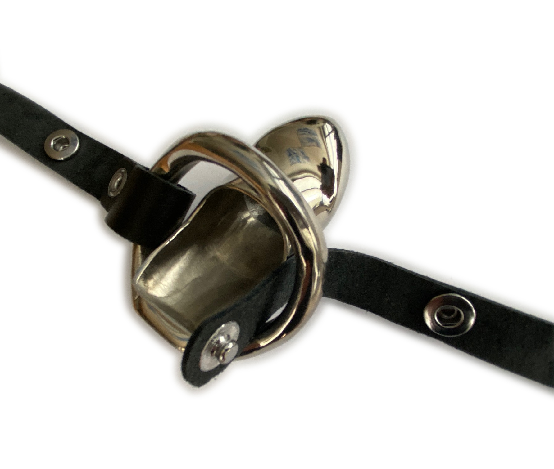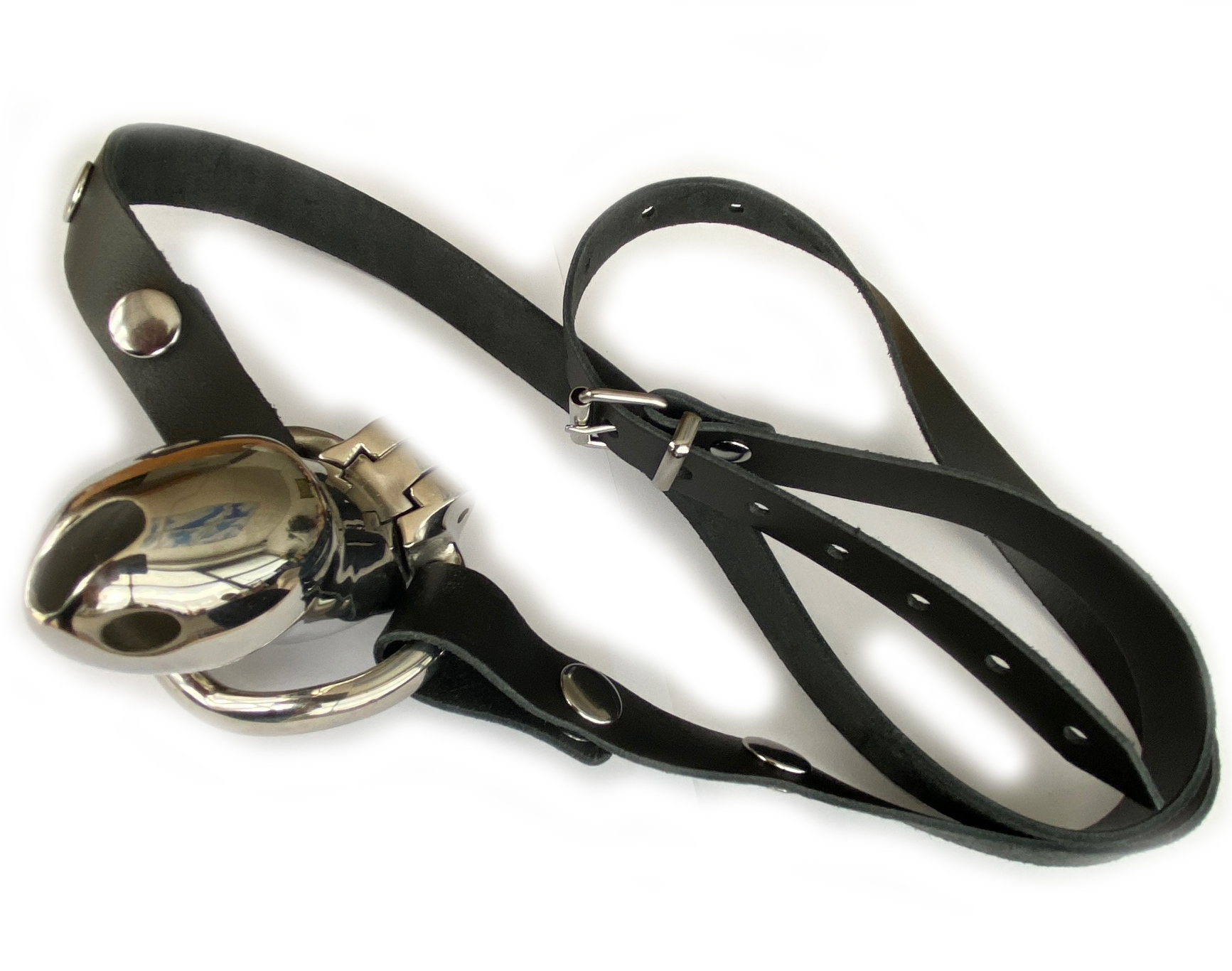 Adjustable black (genuine) leather strap for comfortable carrying of your cage. The leather belt has a buckle closure at the back and can be attached to the (cock) ring of your chastity cage at the front.