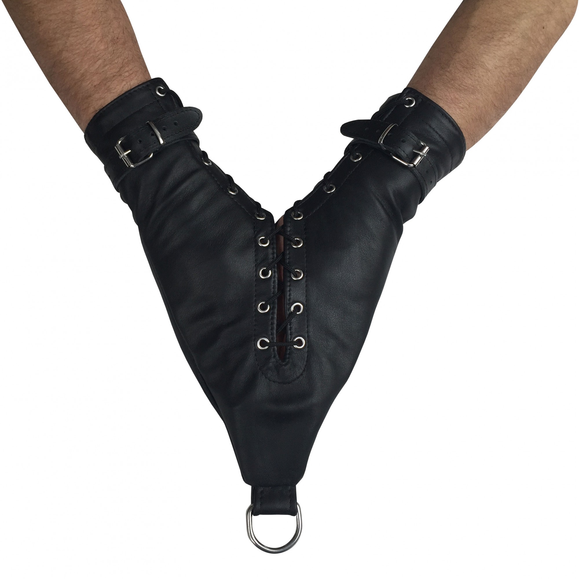 The hands are guided through the short cuff either in front or behind the body. The hands can then be placed tightly together by the lacing and the leather belt, the cuffs can close around the wrists.