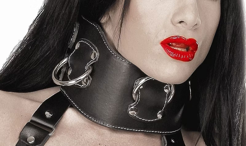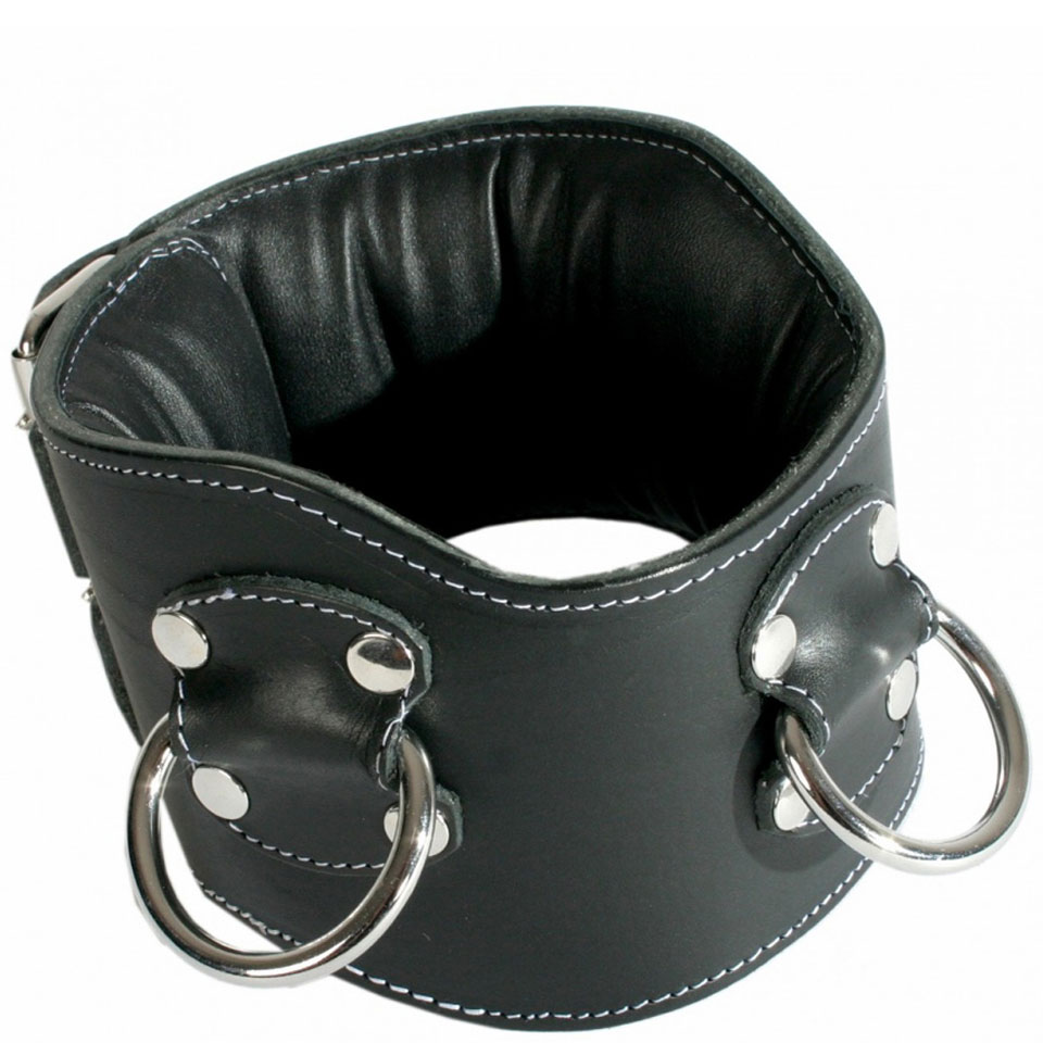 Split cowhide leather bondage, wide collar stitched with white thread and featuring 3 D-rings.