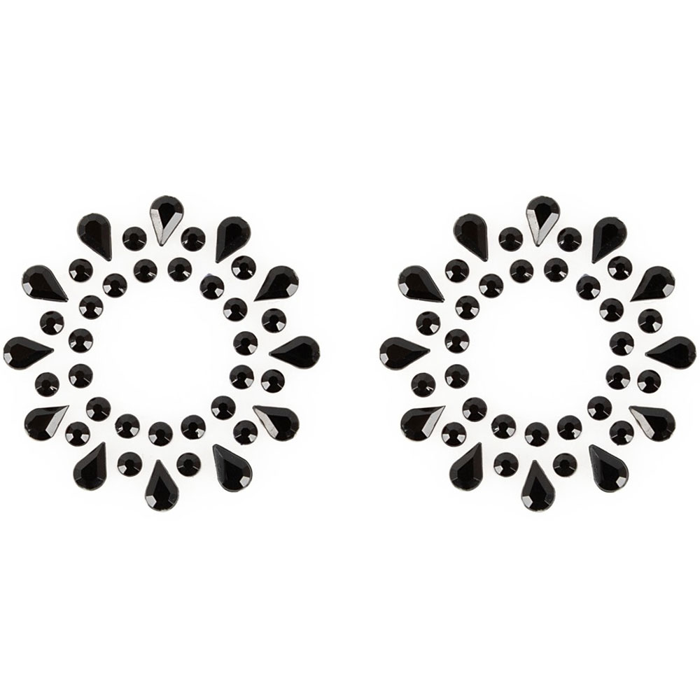 Set of 2 nipple stickers with black iridescent gemstones, recess in the centre for the nipple. Ø 1.5 cm each.