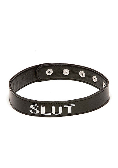 Claim your SLUT with this high quality PVC collar. This comfortably slender PVC collar is adjustable with 5 push buttons, to ensure a snug fit. The collar makes the ultimate statement, with the word SLUT simply stated on the front in raised white Chrome letters. Adjustable notch closure in the back. Ideal for a night out, or a naughty BDSM session...