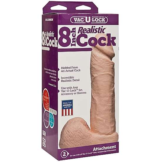 Take in all 8" of this realistic cock Vac-U-Lock attachment. The bulging veins, plush balls, and hand painted detail will have you falling in love! Works with all Vac-U-Lock systems. Proudly Made in America. Phthalate-free, body-safe. Available in White, Black, and Brown.