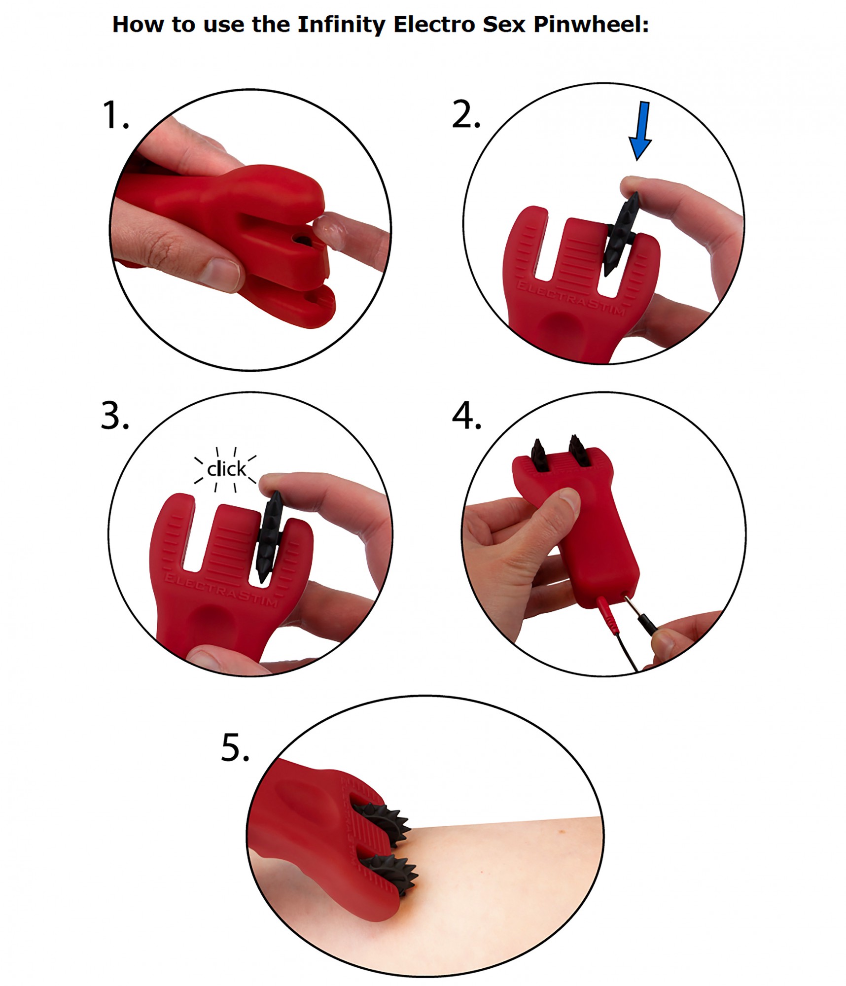 To enhance the stimulation from Infinity we recommend applying our Electro Conductive Gel, (sold separately) to the inner conductive hubs of the Silicone Fusion Infinity Electro Pinwheel handle (1) before use. Once you have prepared both contact points, push the wheels gently into place (2). When the wheels are in the correct place you will hear a faint click as they pop into alignment (3) The wheels will then turn freely. Plug Infinity into your stimulator unit (4) and roll along the skin to experience the sensations (5).