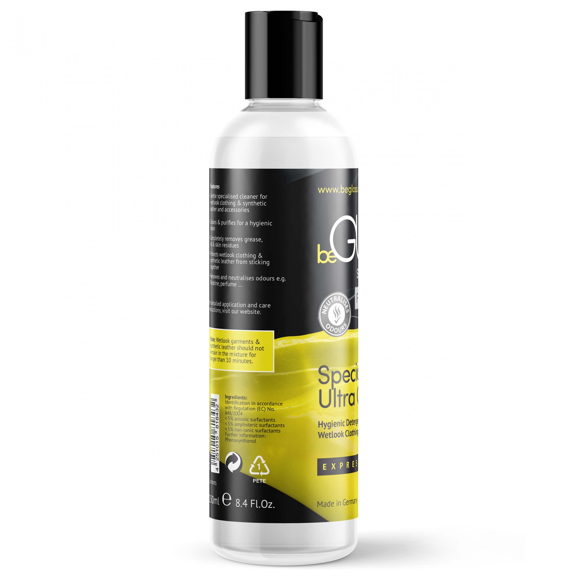 Often even a bad smell can remain in the fabric and make it stink. With the beGLOSS “Special Wash Synthetic Leather” detergent, synthetic leather clothing remains super silky, matt, soft and flexible.