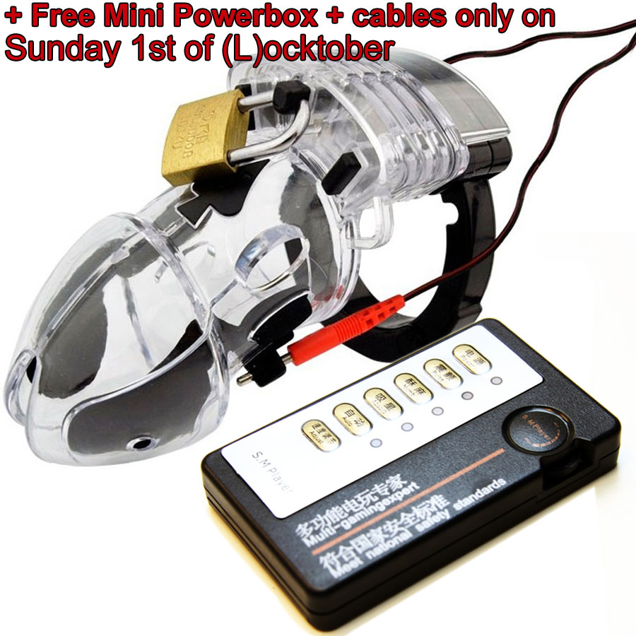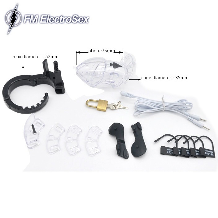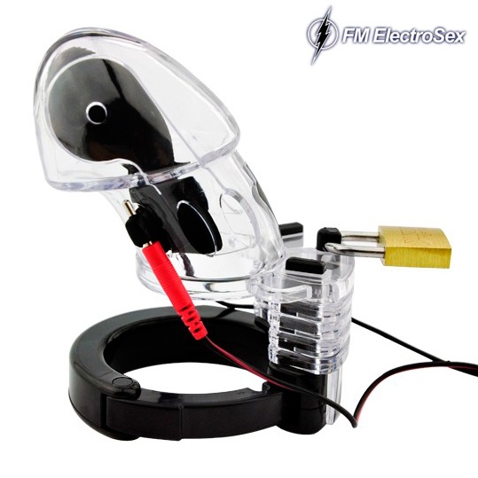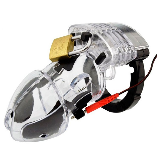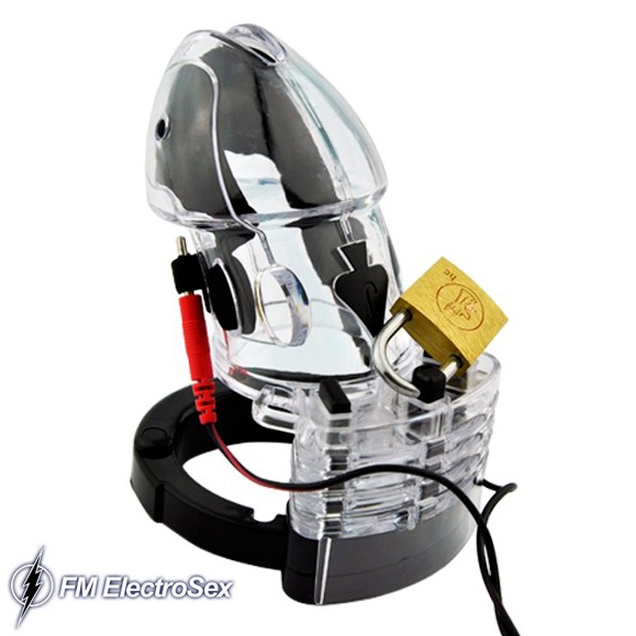 Transparent cock cage with e-stim function: it lets you keep a boisterous willy pent up under lock and key so that he can't get stiff until the domme, or dom comes with the key and lets him out. With the conducting surfaces, left and right, the victim can be treated to your heart's content with tingles, twitches or pulsations in precisely the intensity he deserves.