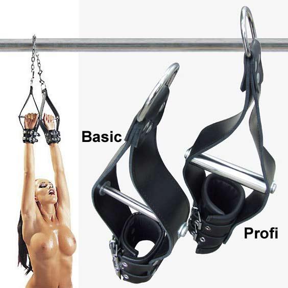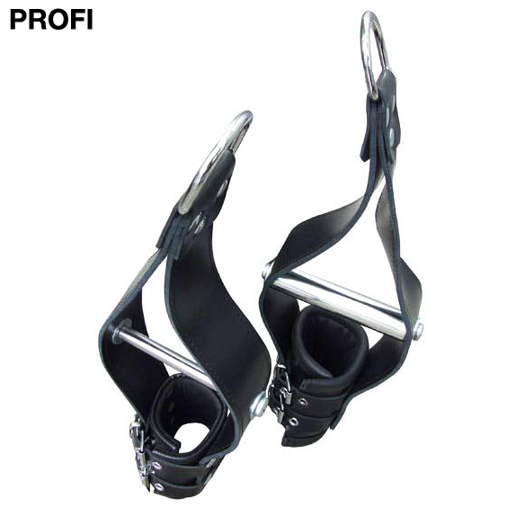 Padded, adjustable leather sleeves in black with stainless steel handles. Supports up to 100 kg. Double snap hook and chains not included. Available in semi-professional version from with leather polstering inside and wide stainless steel handle for more comfort.