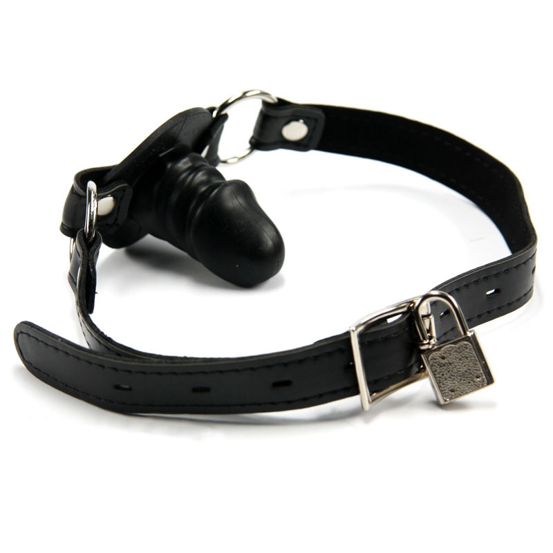 Silicone penis-shaped dildo gag featuring an adjustable, lockable imitation leather strap. Perfect for kinky beginners and experienced BDSM fetishists alike!