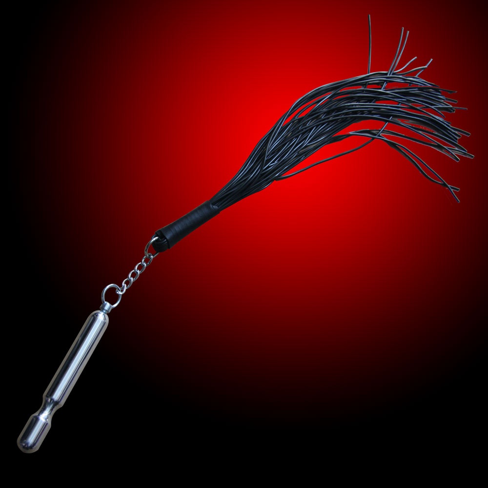 Rotary whip with a glossy, polished aluminum dildo and detachable latex whip.