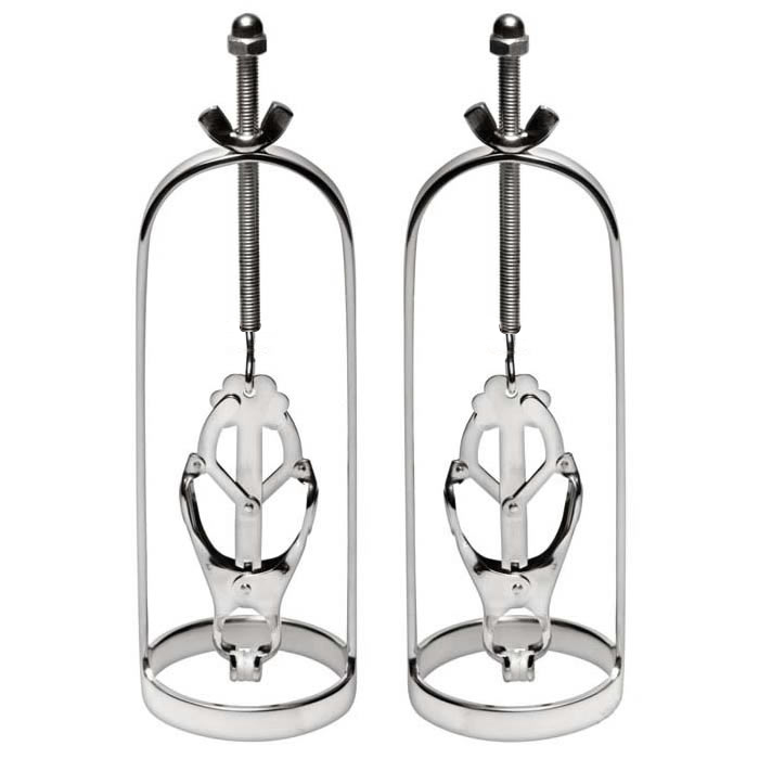 This stainless steel device is about the gradual stretch of the nipples. Using a clover clamp, attached to a wing nut, you are able to stretch your nipples, or your partner's. Use those stretched nipples for devious purposes, including applying other clamps, clothespins, etc.