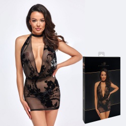 Semi-transparante bustierjurk met strepen, vormende baleinen, verstelbare bandjes van vinyl en decoratieve bandjes. Met een korte, wijd uitlopende rok van glanzend vinyl. Mooie borduursels op de cups, decoratieve vinylstrepen en een doorlopende ritssluiting voor maken de sexy outfit compleet.