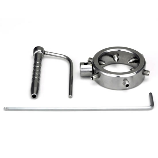 There are 4 screws that encircle the ring. Should a person want to engage in cock discipline, they can use the Allen wrench (included) to tighten the screws against the cock.