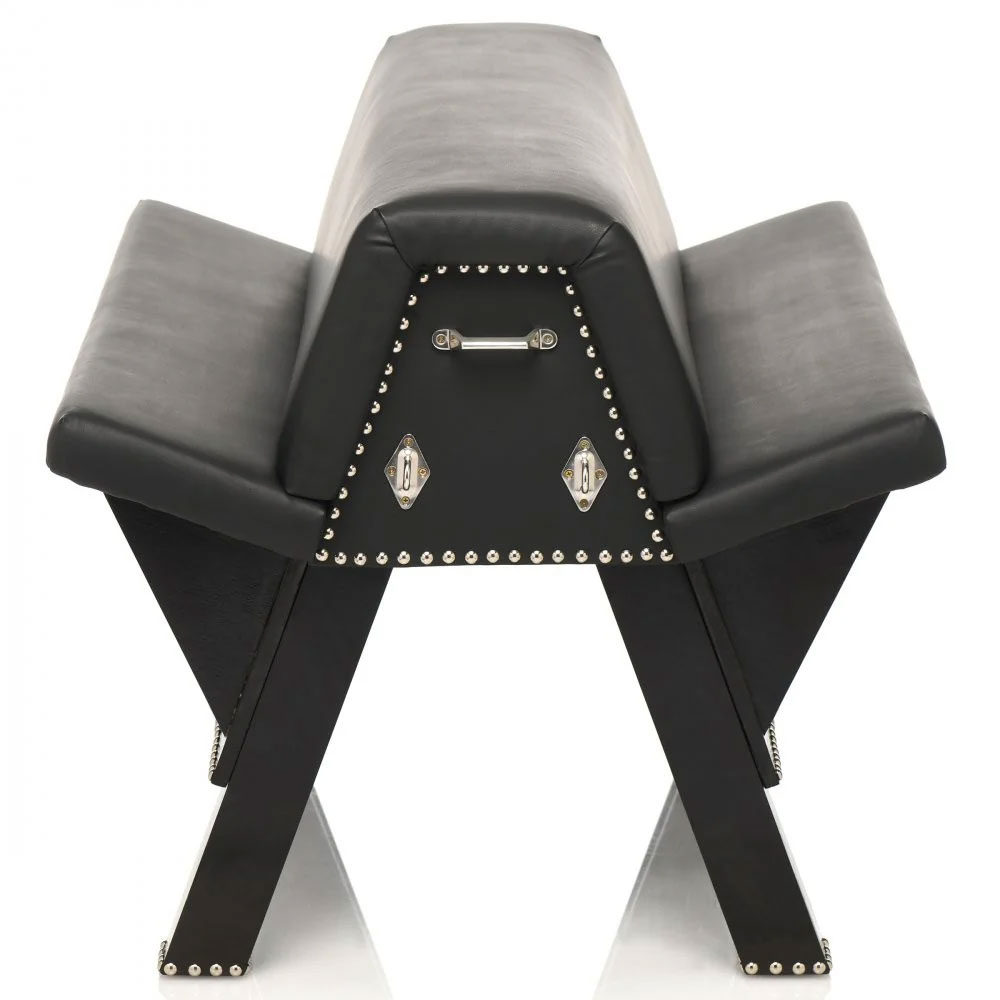 Make your wildest fantasies come to life with this classic bondage horse! Durable and built strong, it's made with a wood and metal frame that can hold up to 660 lbs of weight! You can rest easy and play hard with this spanking horse that gives you it all! Covered with foam padding and sleek, vegan leather and covered in round, nickel-free metal buttoning along the sides it is a stunning addition to any dungeon or playspace! Enhance your scene and keep your submissive restrained to any of the 6 attachment points. Secure wrist or ankle cuffs and any bondage and restraint systems with ease to the front and back of the horse! After play, simply wipe it clean until next time. All metal is nickel-free for sensitive skin.