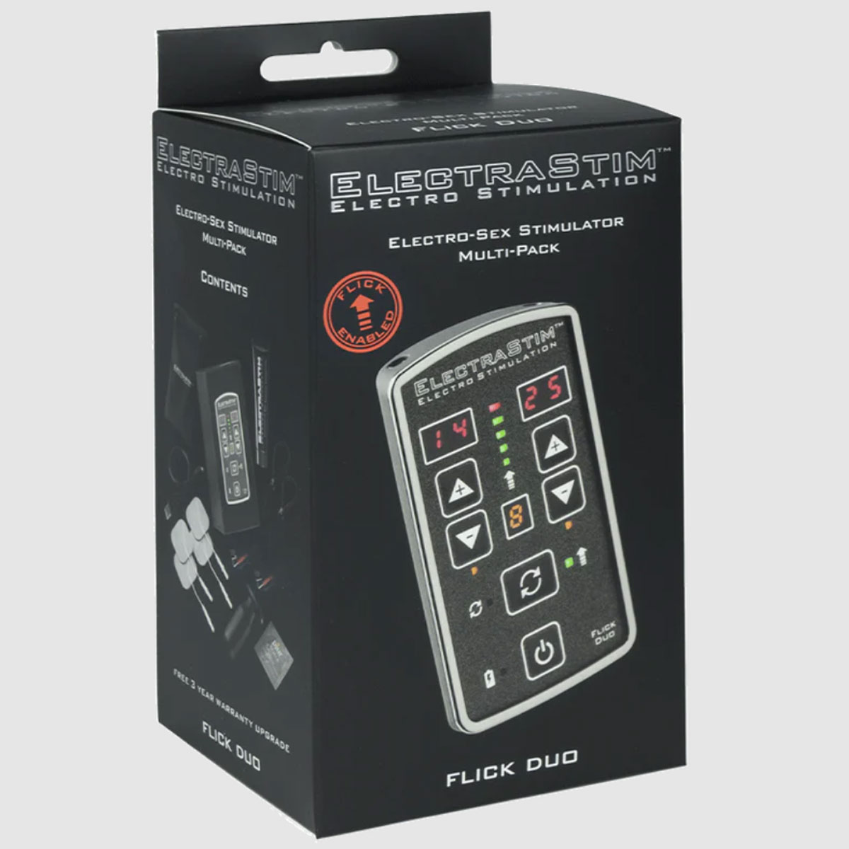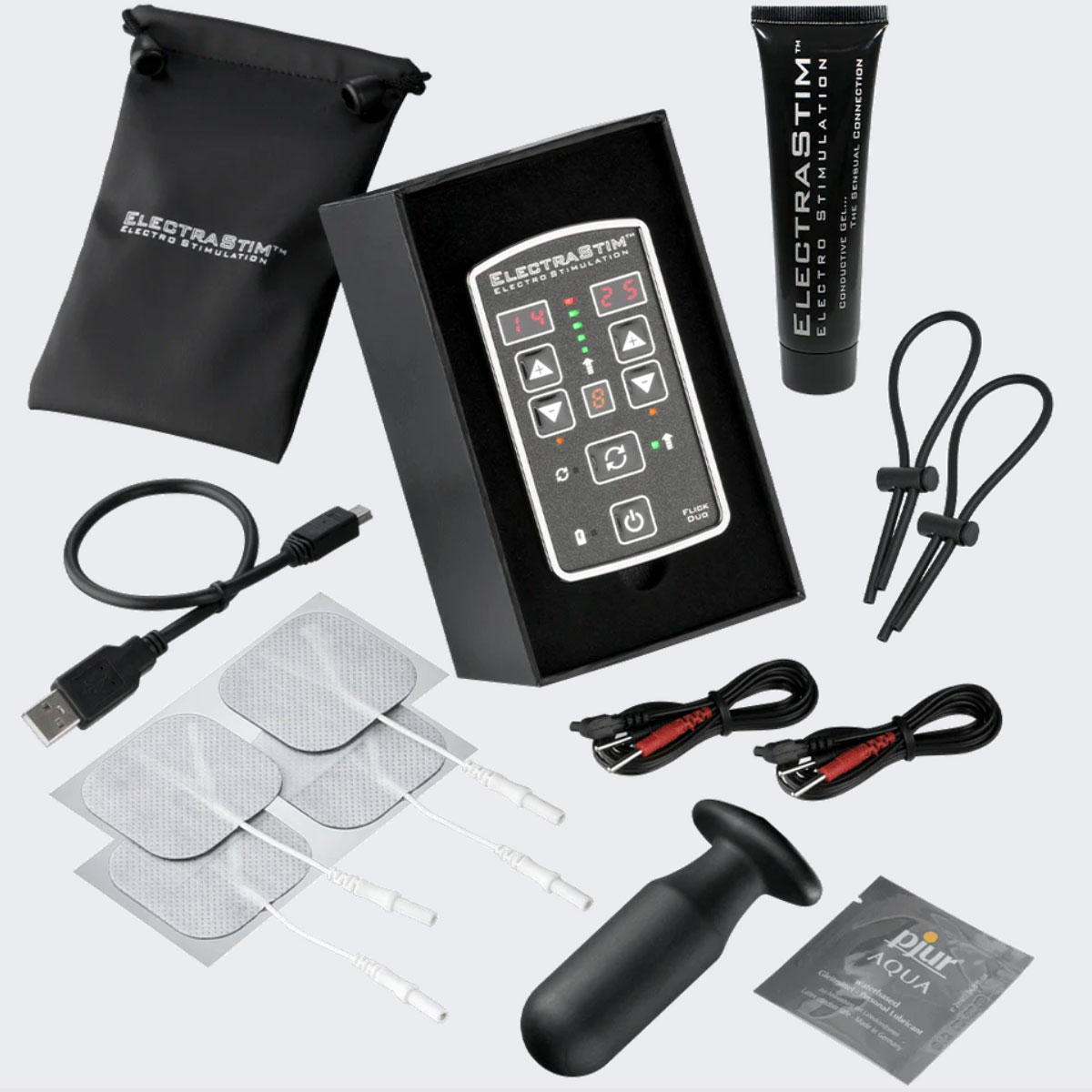 Get the perfect introduction to dual-channel stimulation with the ElectraStim Flick Duo Multipack. Not only do you get the amazing dual-channel ElectaStim Flick Duo Stimulator, you’ll also receive our best-selling Silicone Noir Aura probe (suitable for vaginal and anal use), a pair of ElectraLoops cock rings, 4 self-adhesive ElectraPads and a tube of electroconductive gel.