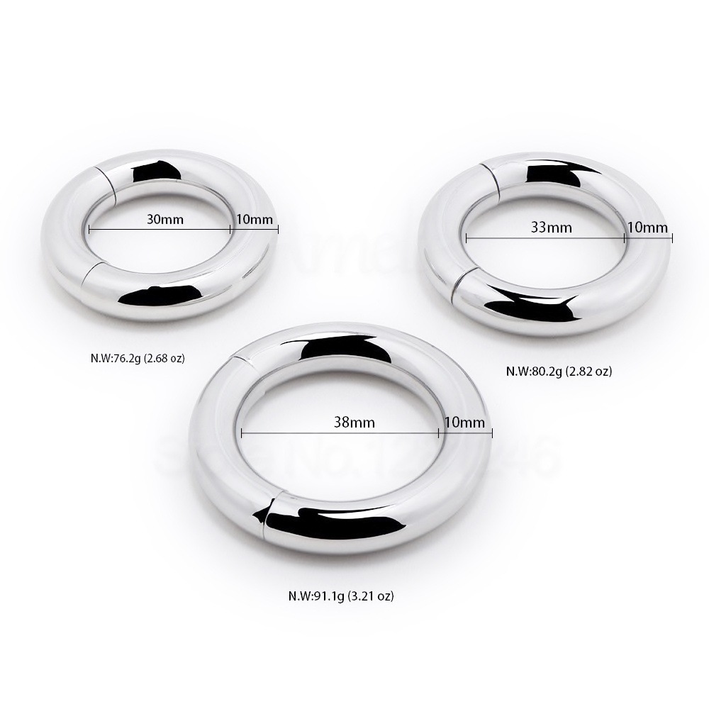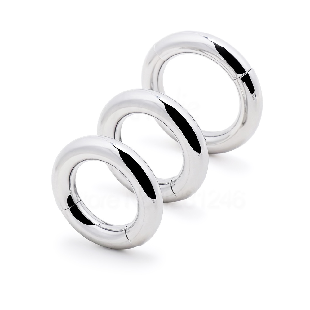 Chromed steel donut ring cock ring, easy to put on and take off with the magnetic panels. The rounded design makes for an especially comfortable wearing experience regardless of the hefty weight of these cockringss. Available in three different sizes.