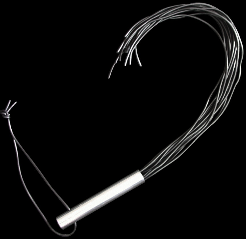 Zweep gemaakt van 12 nasty zwarte PVC-latex striemen bij elkaar gehouden door een aluminium handvat.