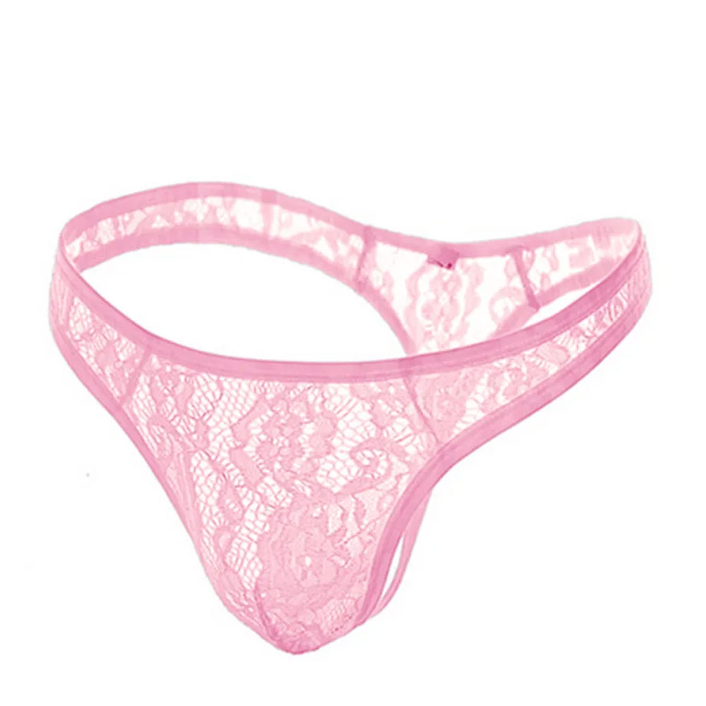 Ideaal voor sissy crossdressing! Roze elastische kanten string met een zakje voor je pakketje. Creëer die vrouwelijke sissy-look zonder in te leveren op comfort.