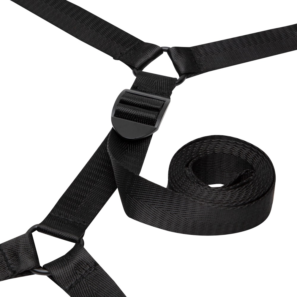 Every bed can be turned into a bondage playground with the bed restraint set Sweet Anticipation Under Mattress Restraint Set from Fifty Shades of Grey. The cross that is made up of adjustable straps fits underneath any mattress. The handcuffs and ankle cuffs can be attached to the straps because there is a D-ring and a snap hook at the end of each strap. The softly padded handcuffs and ankle cuffs can be worn both ways: one side is in a black leather look and the other side is in a black/red satin rose design. All restraints can be adjusted with buckle fasteners.