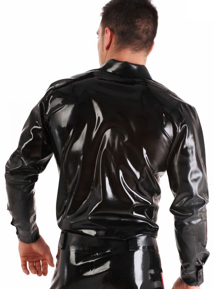 Smart glued rubber shirt in sexy smooth black. Long sleeved, with shirt collar, shaped hem and black press studs at the front and cuff openings. Color: Black