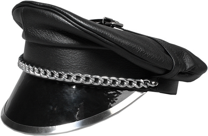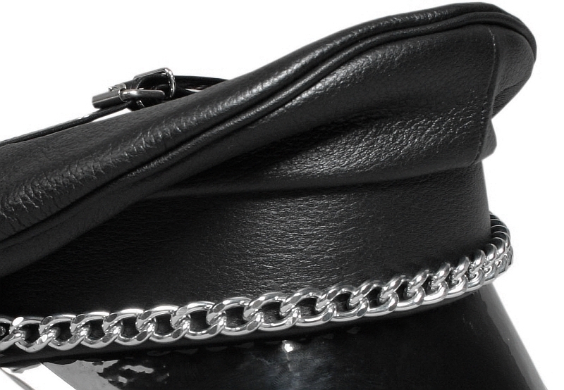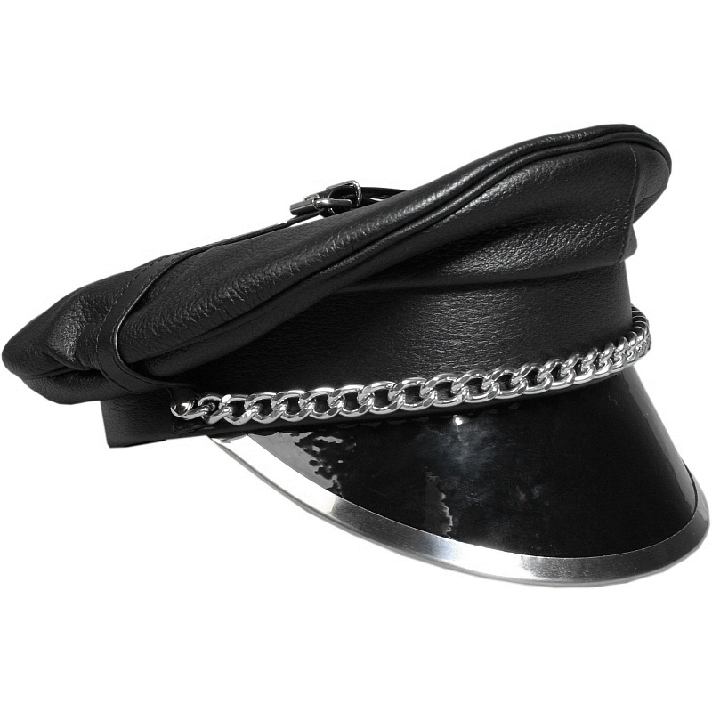 Leren pet met metalen rand en lak bovenzijde. Riemen voor gespen over het hoofd, decoratieve kettingen aan de voorkant. Gemaakt van dik, gebosseleerd leer.