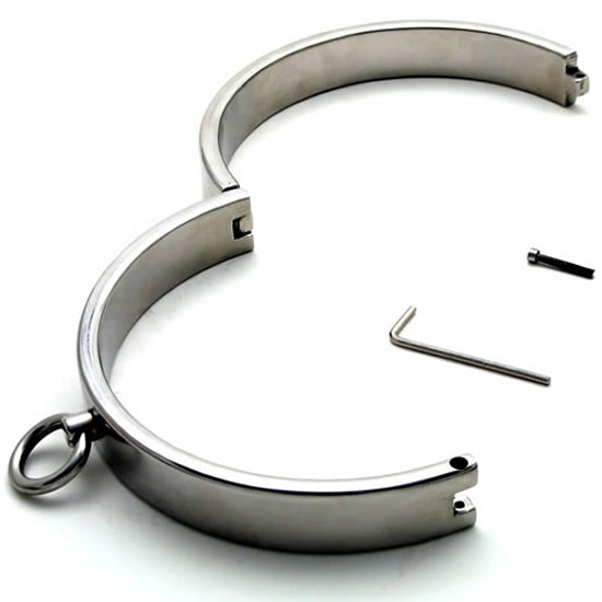 Houd uw onderdanige onder controle met deze afsluitbare BDSM collar. De duurzame en zware stalen collar zal stevig vergrendeld rond uw onderdanige nek blijven zitten. Het slot is een roestvrij stalen inbusbout welke geopent kan worden met een kleine inbussleutel (meegeleverd). De collar heeft een O-ring voor bevestiging aan kettingen, banden e.d. waarmee u uw sub kunt aanlijnen en rondleiden.