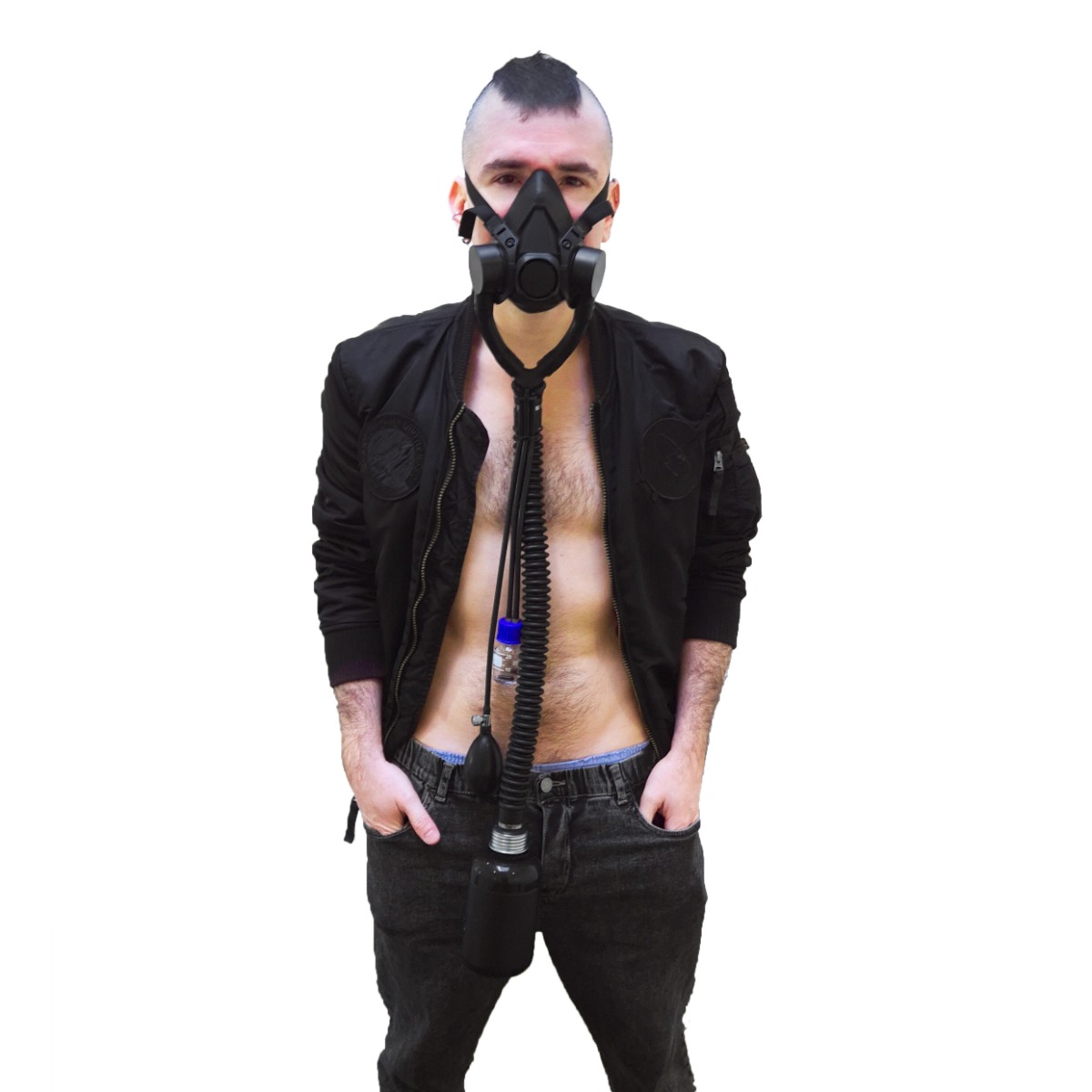 If you buy the GASMASTER Aroma Pump Half Gas Mask, you will be able to discover the Poppers and have a full haircut.
