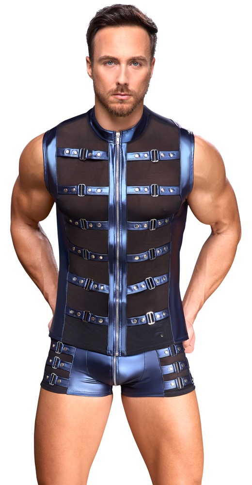 The tight, emphasising pants from NEK have a zip over the padded pouch. The pants are made out of cool metallic blue matte look material and they have studded straps at either side. There are also transparent black powernet inserts under the straps. They are soft and stretchy, and they have a fabric-covered, elastic waistband for maximum comfort.