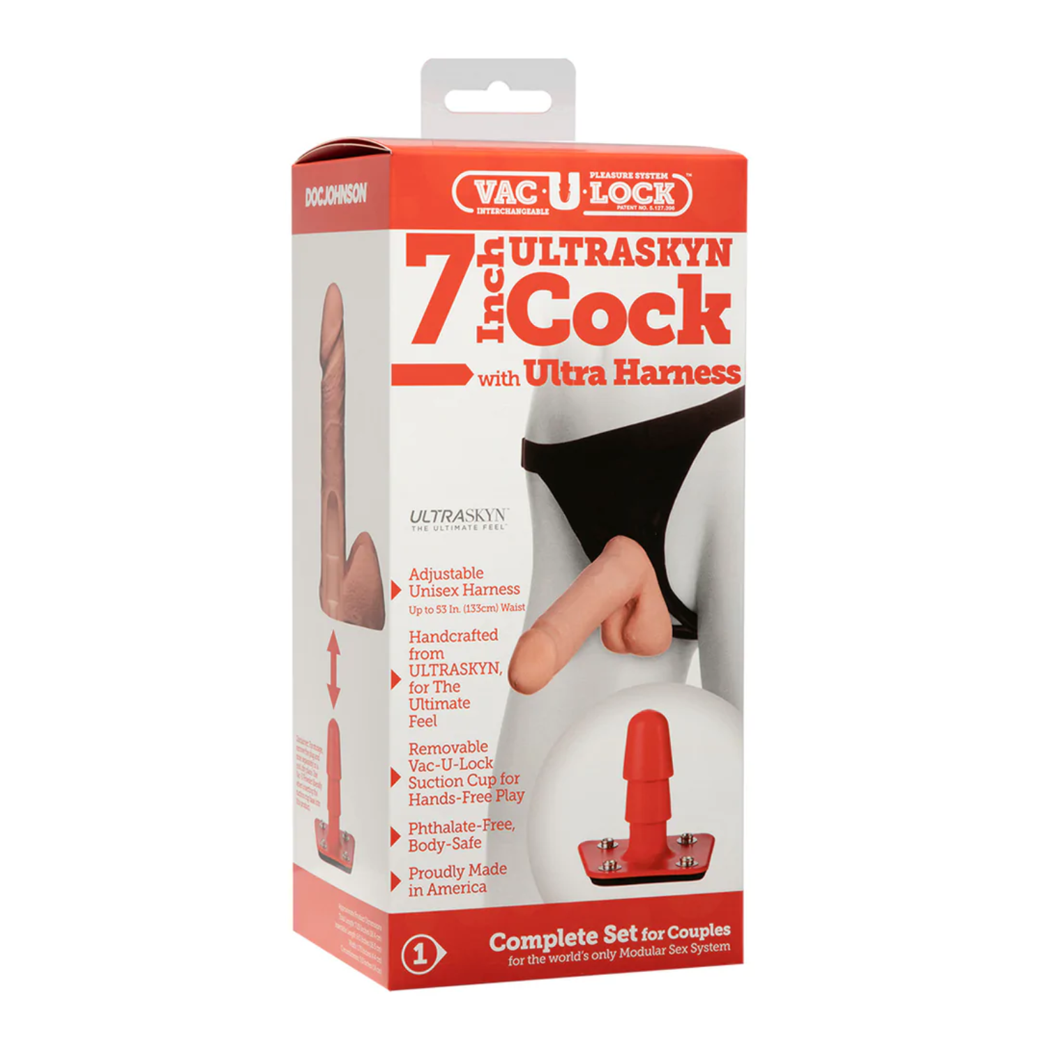 Looking for the ultimate in Strap-On fun? Look no further! This Vac-U-Lock kit includes the most lifelike cock around-- a 7 Inch ULTRASKYN™ Cock with plush balls, distinct veins, and a bulbous head! The kit comes complete with a comfortable and adjustable Ultra Harness (up to 53"), a patented-designed Vac-U-Lock Plug, and a Vac-U Powder dispenser to make attaching and detaching smooth and easy! Made of phthalate-free, body-safe material